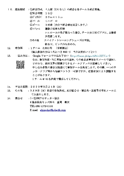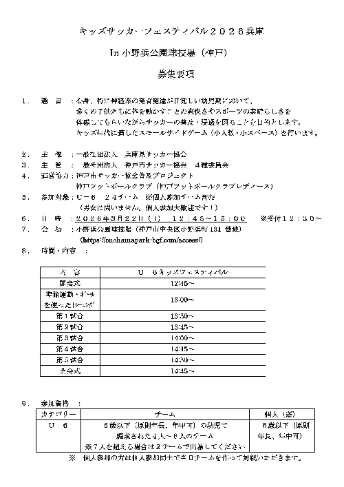 | 1. 趣 旨 :心身、特に神経系の発育発達が目覚しい幼児期において、 多くの子供たちに体を動かすことの爽快さやスポーツの素晴らしさを 体感してもらいながらサッカーの普及・浸透を図ることを目的とします。 キッズ年代に適したスモールサイドゲーム(小人数・小スペース)を行います。 2.主 催 :一般社団法人 兵庫県サッカー協会 3.主 管 :一般社団法人 神戸市サッカー協会 4種委員会 4. 運営協力:神戸市サッカー協会普及プロジェクト 神戸フットボールクラブ(神戸フットボールクラブレディース) 5. 参加対象:U−6 24チーム ※個人参加チーム含む (男女は問いません。個人参加大歓迎です!) 6. 日 時 :2026年3月22日(日) 12:45〜15:00 ※受付12:30〜 7. 会 場 :小野浜公園球技場(神戸市中央区小野浜町131 番地) (https://onohamapark-bgf.com/access/) 申込み期限:2026年2月24日(火) その他 :3月9日(月)目途で参加決定、及び組合せ・振込先・注意事項等をメールにてお送りします。 問合せ :(一社)神戸市サッカー協会 4種委員会キッズ担当 重岡 耕太 TEL 090-4273-4144 E-mail shigeoka@kobe-fc.com 申し込み用紙希望の方は、下記まで連絡してください。 西宮サッカー協会キッズリーダー養成講習会 事務局 上前 治 メールアドレスuemaeosamushiden@yahoo.co.jp |